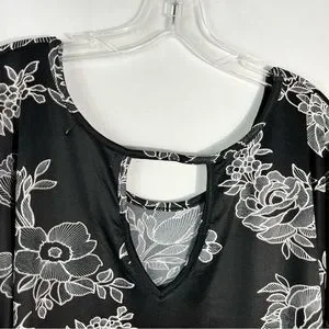 In good condition! Black blouse with a white textured floral print all over. Layered ruffle details on the sleeves. Keyhole cutout in the back. Gently used. No rips, stains, or holes!