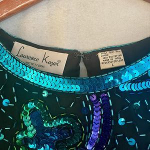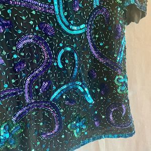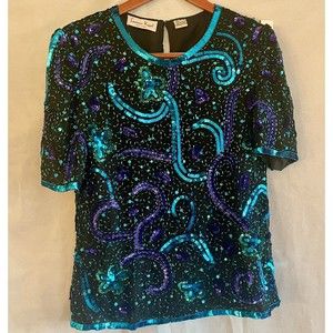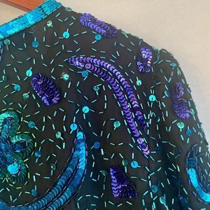 Lawrence Kazar VTG Womens Silk Beaded Sequin Blouse Size Large Black Blue Purple