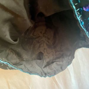 This is a stunning vintage Laurence Kazar silk blouse. Featuring a round neckline with a hook and eye closure, this blouse is perfect for formal occasions or a night out. The abstract pattern in black, blue-almost aqua or teal in color, and purple is accented with intricate beading and sequins. Made in India.