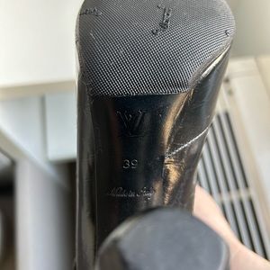 Louis Vuitton Genuine Patented Leather Ankle Boots. Size 39. Made in Italy. Worn twice. I had shoemaker to put geniune Italian leather protection on the boots sole and hills. Boots have a beautiful fold design with button detail. Statement and very trendy and chick. Excellent condition. I don’t have a box any longer.