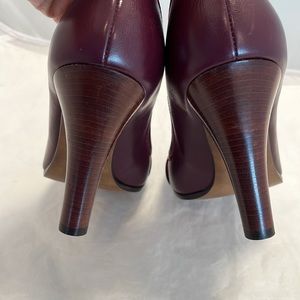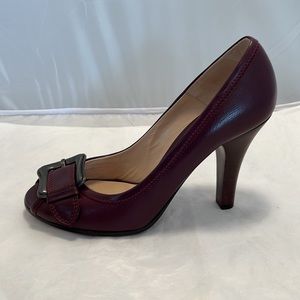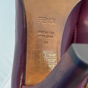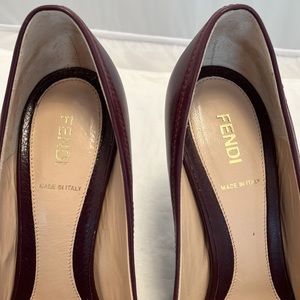 Authentic Fendi leather open toe pumps with front buckle. Done in a burgundy color way. Antiqued brass buckles at front. No heel or toe imprints. No odor or stains. No tears or scuffs to leather. Stacked wooden heels have slight scuffs and/or scratches, but minimal. Heel lifts are not worn. Icludes extra heel lifts. Includes Fendi dust bag. Beautifully done as only Fendi can do. Guaranteed authentic. Made in Italy. #R321111795.