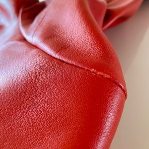 Excellent like new gorgeous lux feel to leather featuring raised criss cross diamond pattern piping seam to front. Beautiful condition. There is tiny wear flaw on shoulder near the seam present at time of purchase as new. See Photos. There are no stains rips or tears to leather. Clean lining and pockets inside . Rarely worn, maybe once. This was my mom’s.