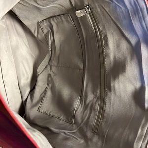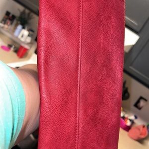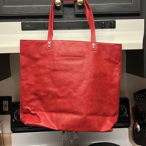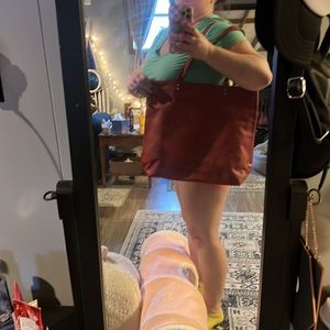 Brand New NEVER BEEN USED!! Faux Leather.Red/Brick color. 1 exterior hidden flat pocket. 2 interior flat pockets and 1 zipper interior pocket. In EXCELLENT CONDITION!! 12”H x 15”L at base 19.5”L at top x 6”D and 11” Handle Drop.