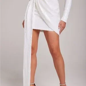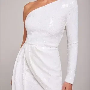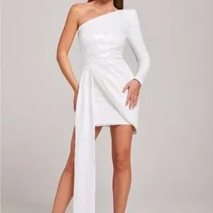 Size XS. Worn once. Perfect condition. The CELINA White Dress has a structured one-shoulder design, asymmetric floor-sweeping drape and a silhouette crafted from white sequins.
