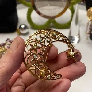 Really rich looking Brooch , Avon Moon with Star hanging dow, goes well with any Kirk's Folly if any of you are collecting. Gold with crystals