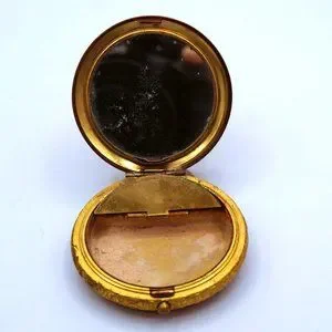 This Vintage Elgin Style Brass Rouge & Powder Lions Club International Emblem Compact has not apparent hallmark. This compact is from the 1940-1960s. There is just a little powder left and most of the original rouge. Everything is in good working condition and intact. There are small scratches and smudging that requires cleaning and a polish.