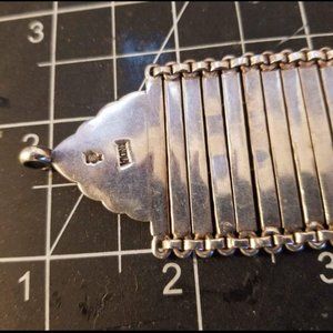 Vintage Rajasthan Sterling Silver Bracelet. Length 8" ( not including clasp) by 1.5" wide. Beautifully crafted Silver bars linked together. Carved leaf designs and details on the ends. 925 Silver made in India. This is a thicker cuff bracelet with flexibility. Feels smooth. Was from my Iyengar Yogi from India. You can see the artist stamp on the inside. A favorite nice heavy thick silver statement bracelet. Can also be worn with bellydance costumes. can also use as an arm cuff with a leather tie. Unisex, non gender.