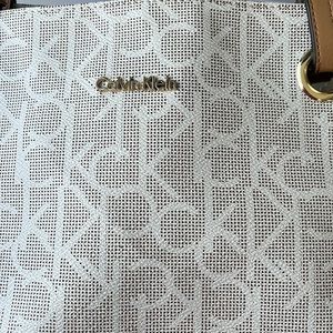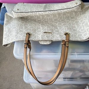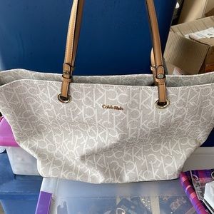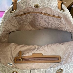 Calvin Klein Logo Huge Tote 20 x 11.5 x 7.25" Cream w Cognac Handles NWOT