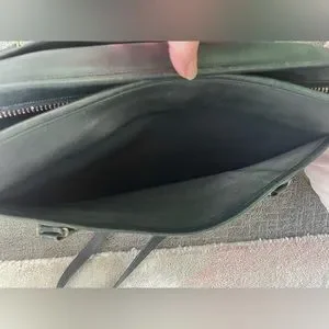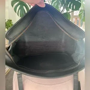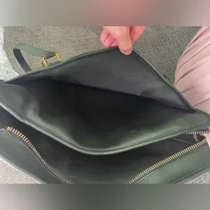 Front and back outside slip pockets, chunky zipper closure. Has original hangtag. Immaculately clean interior. Straps are long for comfortably carrying a laptop.