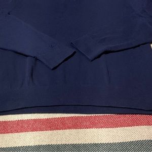 Solid, deep Navy sweater, relaxed fit, v neck works well as a layer over a button down, or kept casual over a tshirt. Waistband and cuffs look in shape. No holes or stains.