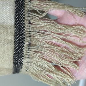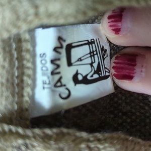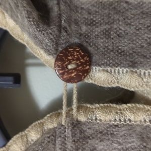 Gorgeous, super soft, warm, cozy, Alpaca hooded poncho in neutral shades of brown, tan, cream. Open front single button closure.