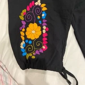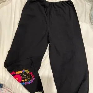 Mexican embroidered pants. Black, cotton/linen like fabric, drawstring around waist & ankles to adjust to your liking. Pockets in front. Size large. Bought on Etsy but too big for me. Brand new, never worn. Very cute!