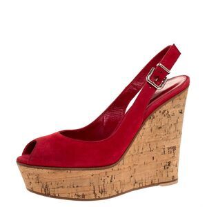 Gianvito Rossi Red Suede Leather Cork Wedge Peep Toe Platform Slingback Sandals
