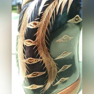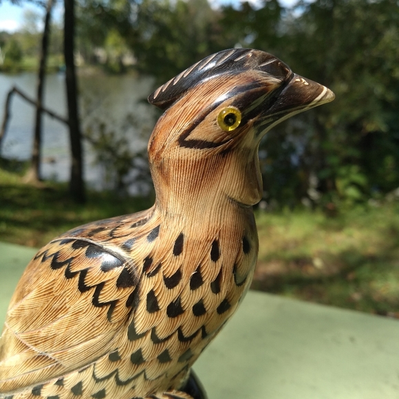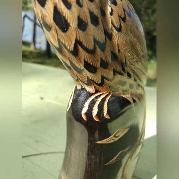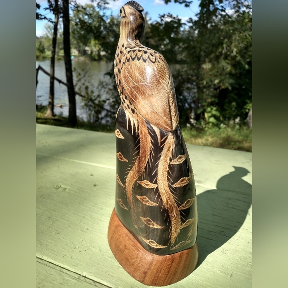 I really love this statue / sculpture of what looks like a peacock but it probably a quetzal. It appears to be carved from a water buffalo horn and mounted on a wood base. The bottom just says Bangkok, Thailand. It is very detailed *please check close up photos). A real work of art. The front of the sculpture shows wear and ridging from the horn. I'm tempted to keep this for myself.