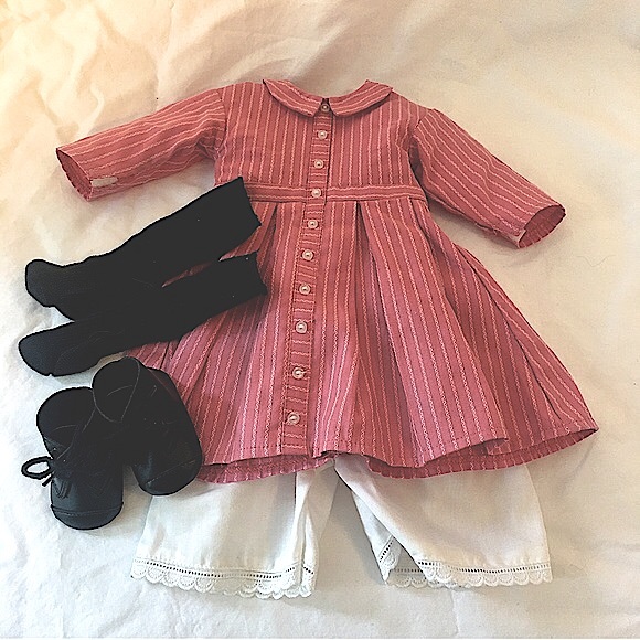 comes with the Addys cinnamon pink striped dress, eyelet drawers, black stockings and capped toe boots she was purchased in.