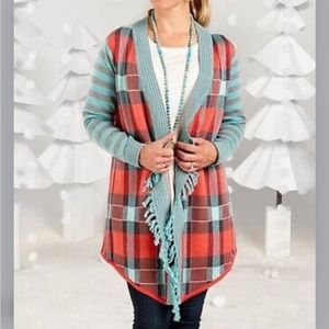 Matilda Jane Open Front Cardigan. Gorgeous orange/red & teal green plaid. Fringed waterfall open styling. Long sleeves. Laying flat approx 28” shoulder to hem, approx 18.5” pit to pit. 60 cotton 20 polyester 20 viscose. Size S. Great condition with slight signs of wash & wear. No holes, picks, stains.
