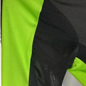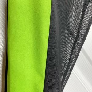Very stretchy and form fitting, long mesh sleeves with strip of green material, strips of mesh fabric along front and back sides