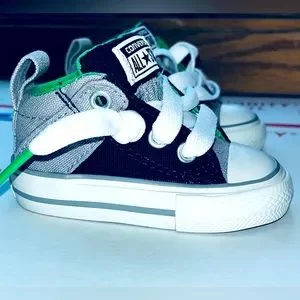 For sale is a LIKE NEW (worn once) pair of Chuck Taylor All Star ‘Street Mid’ Sneakers, in the Grey, Black and Green color-way. Toddler Size 2C - $20
