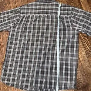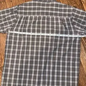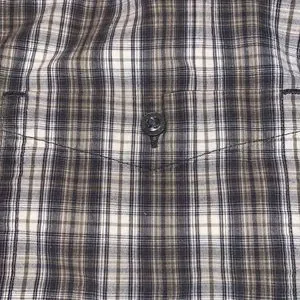 The North Face Button Down shirt. This is a conservative plaid pattern of black, brown, gray and white. It has a left breast pocket. Well made and should wash well. Would look good tucked in or out. Almost new condition. No flaws.