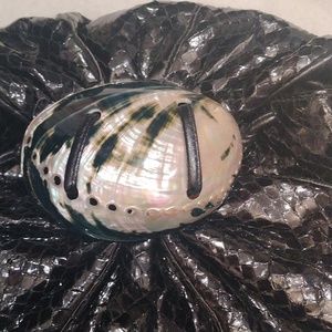 Gorgeous snake skin and leather handbag from Meyers. dyed black with a abalone shell decorative accent on front, adjustable strap, never used, inside is pristine.