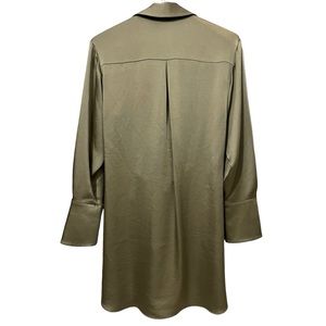 The Roma Mini Dress in Willow. A sensuous recontextualizing of the shirtdress. Lush folds of high-sheen satin radiate from circular hardware detail. Mini-length silhouette cut for slight relaxed fit with deep-v neckline.
