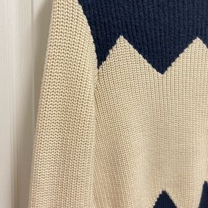 Size medium. Navy and cream knit full zip front jacket with large fold over collar. Wool and Alpaca blend material. Leather zip pull. EUC. No trades.