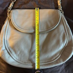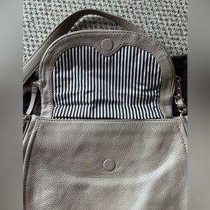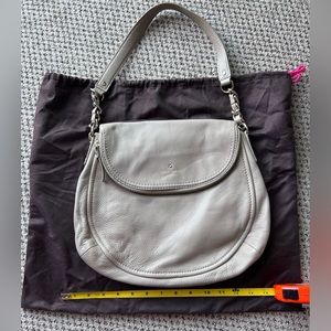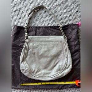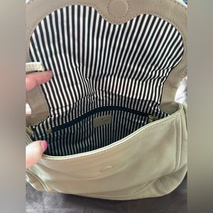 Hardly used, if at all! Stone colored, black/white lining, magnetic closure beautiful bag in perfect condition! Comes with dust bag.