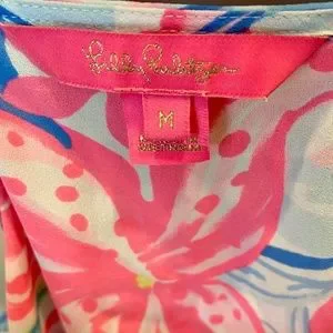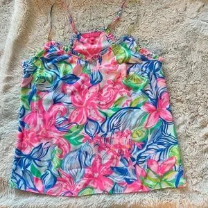 Get ready to turn heads with this stunning Lilly Pulitzer multi-colored women's medium racerback tank with spaghetti straps. The floral pattern with a mini ruffle edging the top of the tank makes it the perfect choice for a festival or beach outing. The adjustable straps and lightweight material ensure that you stay comfortable while on the move.