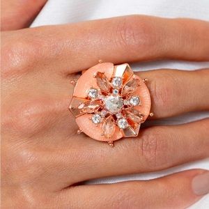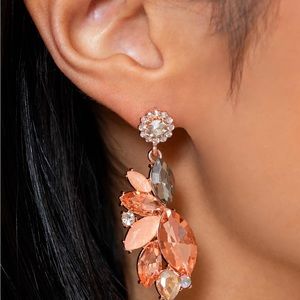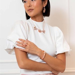 Modeled after a sand dollar motif, an explosion of marquise-cut peach gems and round white and iridescent rhinestones rest atop a shimmery rose gold disc accented with shimmery Tender Peach marquise-cut beads. Pronged in rose gold fittings, a refined display of peachy, champagne, white, and iridescent gems and rhinestones in round and marquise cuts fan out in a clustered display beside the rose gold center, creating a spectacular centerpiece. Necklace Features an adjustable clasp closure. Due to its prismatic palette, color may vary. Set has four pieces