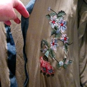 Beautiful olive green kimono with embroidered flowers. Tag says OS, but I would say it fits best up to a medium. Adorable kimono. I wish it would fit, but it's tight on me. Sorry about all the wrinkles. 😫
