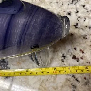 Hand blown blue striped fish with blue variations body and clear fins, tail and nose. In excellent condition with original HQT tag. Measures 9” nose to tip of tail.