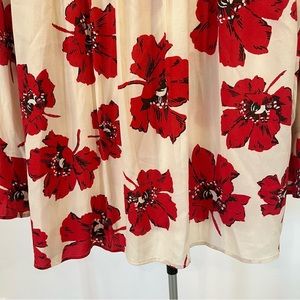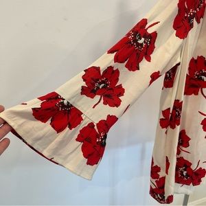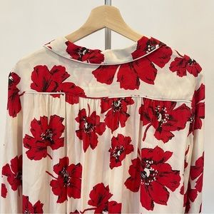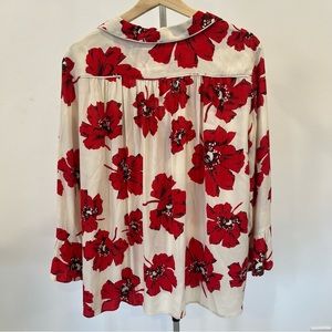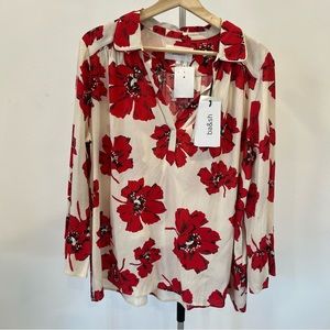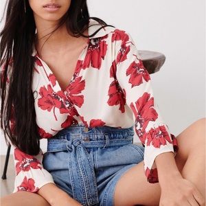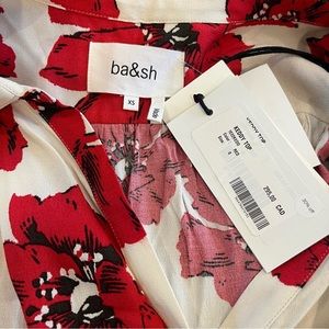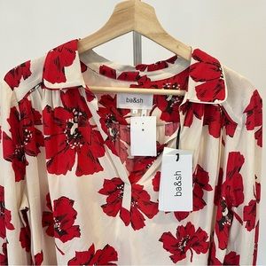 Website description: The ba&sh KEDDY blouse has delicate charm. This top features a deep V-neckline with polo collar and half button placket. The 3/4 sleeves have medieval-style frilly cuffs. In soft, flowing fabric with a bold floral print. Check out the well-finished details including gathering under the shoulder panels and piping that add character. A cute top with buoyant style.