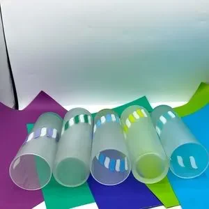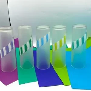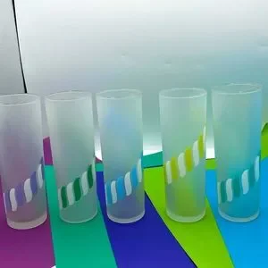 Set of 5 white frosted glasses with a rainbow of colors. Purple/white, green/white, baby blue/white, lime green/white, light teal/white.Highball glass but can also be used for any beverage of your choosing be it alcoholic or non-alcoholic alike. Beautiful glasses for any barware collectors. No chips, cracks or crazing.