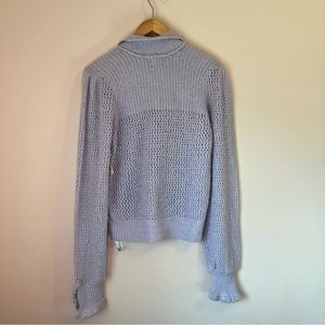 New with tags. Free People Care Snowdrift Pullover Sweater in Periwinkle Ice. Pullover sweater featuring n a henley-style/polo silhouette with defined open knit detailing throughout. Ruffled sleeve cuffs.