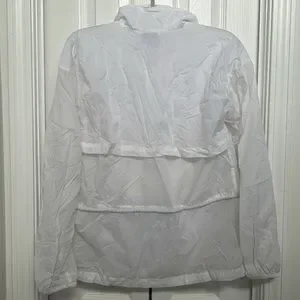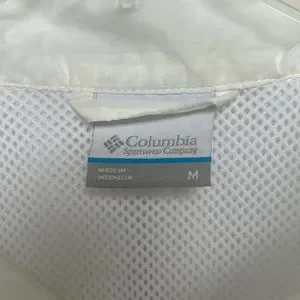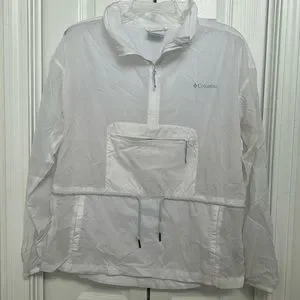 Columbia half-zip rain/wind pullover. Size M. Material is waterproof and very thin so although color is white, you can usually see through it when it is worn. Overall not worn often and great condition!