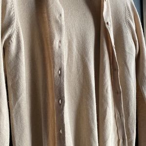 Gently used set. Vintage. Beige/Crème. Very comfortable. Pearlescent buttons. The sweater has some tag issues and a small discoloration. The tag has became unthread at two points but has not caused distress to body. Cardigan is slightly wrinkled.