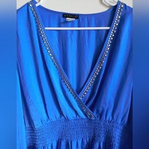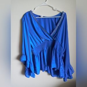 Size 1X V Neck Studded blouse peplum long sleeve pretty top polyester Blue