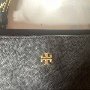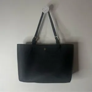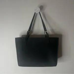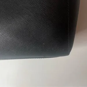 Beautiful small tote wrapped in saffiano finished leather with polished golden tone hardware. Center zippered hanging wall compartment.