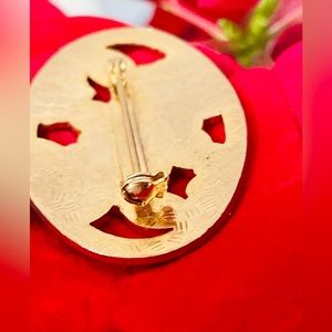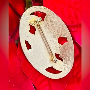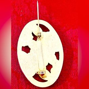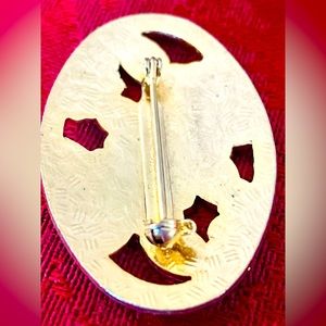 Vintage Cloisonne Floral Design Brooch. Vintage. Pre-owned. Gold tone. Oval Shape. White and Burnt Orange/Red Floral Enamel Cloisonne Design with Cut Out Brooch. Enamel in white, burnt orange, peach and dark green. Brooch clasp on back is in good functioning order. Please view photos as they are part of description. Approximate dimensions: 1 10/16 inch wide x 1 3/16 inch long.