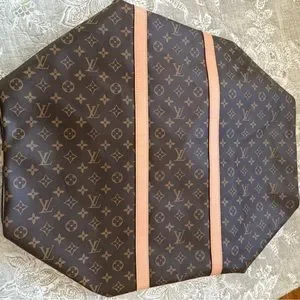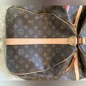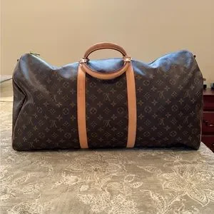 Beautiful, authentic LV keepall Bandouliere 60, this is the big one! Bag was only used twice and is very clean. There are a few small rubs, you have to look close, a couple of marks on the vachetta and handles. There is a black scuff on the bottom of the bag, you can see it on the left side in the last picture, it is in the dark brown and does not cross into the monogram pattern. The interior is very clean and odor free. Flaws shown in pics so zoom in closely and ask any questions. Comes with strap and luggage tag only. I have the dustbag which is negotiable.