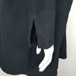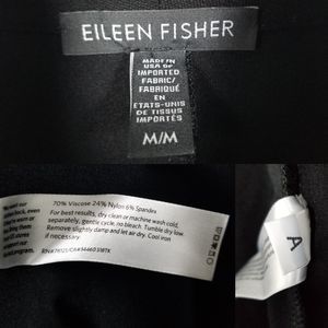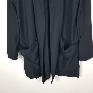 Used black cardigan by Eileen Fisher. Gently used, small mark at rear neckline. Knotched sleeve cuffs, deep front pockets, and open front. Fantastic layering piece. Definitely better for the warmer months or just a great loungewear piece. Not a flaw, but material tag appears to have been sewn in upside down (likely factory defect).
