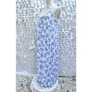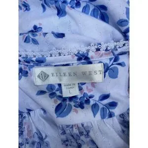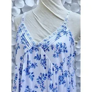 This beautiful Eileen West nightgown is perfect for any season, with its comfortable knit cotton modal fabric and adjustable straps. The blue floral pattern adds a classic and feminine touch, while the accents of bow, ruffles, and embroidery make it even more special. The maxi length and sleeveless design make it versatile for any occasion, whether it's a cozy winter night or a breezy summer evening. This gown is machine washable for easy care and is in NEW condition