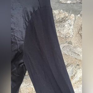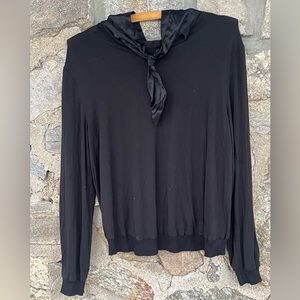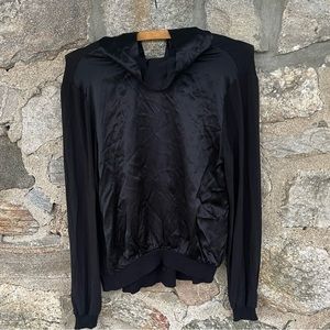 No fabric tag - feels like a satin front/tie, jersey sleeve/back. Soft and feels comfortable.