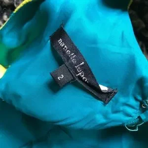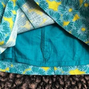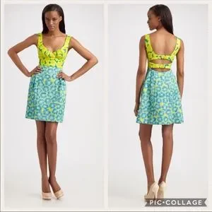 Nanette Lepore Girls only sleeveless dress, yellow and teal flower print pattern, size zipper, size 2, excellent pre-owned condition, fully lined. Approx measurements laying flat: