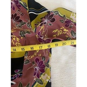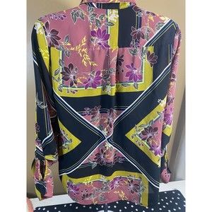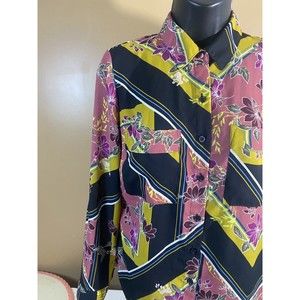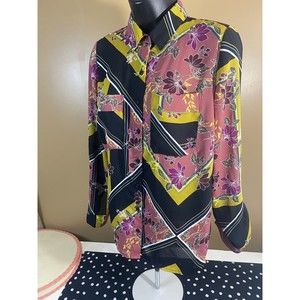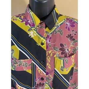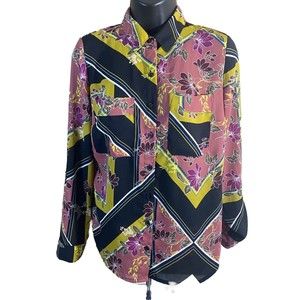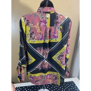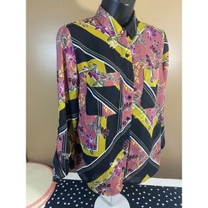 This Apt 9 button-up top in size XS is a colorful addition to any wardrobe. The top features a striped and floral pattern with a collared neckline and button closure. The long sleeves have slit openings with button accents, and the top also includes convenient pockets. Made of a comfortable cotton blend material, this versatile top can be worn for various occasions including travel, parties, casual outings, and formal events. It has a slim fit and is a regular size. Add this basic yet stylish top to your collection today!