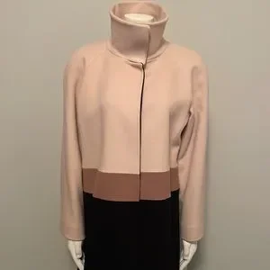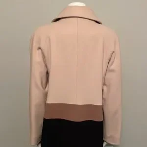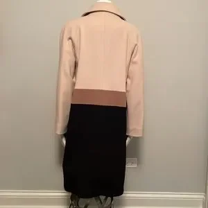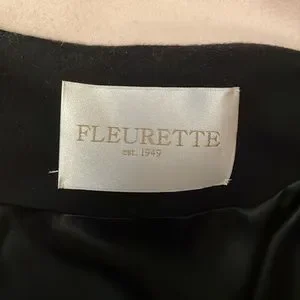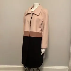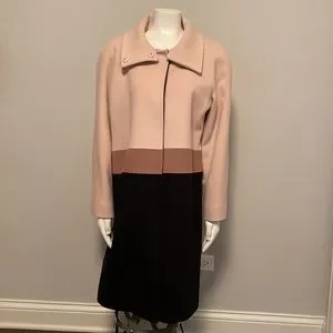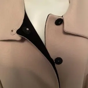 Fleurette Loro Piana Camel, Black and Tan Wool Car Coat. Size 14. 100% Wool, luxuriously soft. Beautiful stripe falls at waistline and when paired with black at the hips is slimming. Hidden snaps enclosure. Collar can be worn up or down, depending on weather or look to be achieved. Fully lined. Made in USA. Gorgeous luxury item. No longer fits me, otherwise would keep forever. EUC. No visible flaws. 22.5" armpit to armpit flat, 39" shoulder to hem.