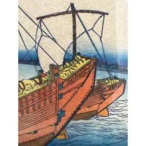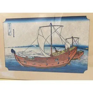 Vintage Japanese Woodblock Print of Boat Ocean Fibrous Paper Framed 15.5" x 11"