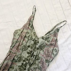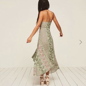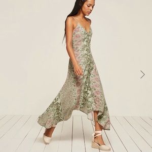 Gorgeous green floral midi dress from Reformation. The style is called Savannah and the print is called Foliage. The slip dress has a midi length, asymmetrical hem, v-neck, and covered buttons down the front. It also has adjustable spaghetti straps. Only worn once so it’s in perfect condition!