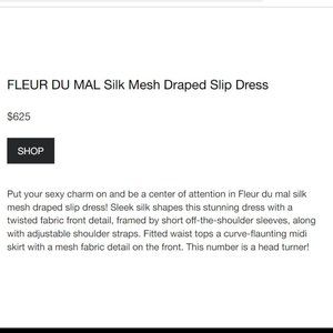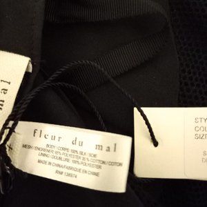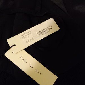 Stunning black silk twist front dress from Fleur Du Mal. Thin straps and draped off shoulder straps give it a simultaneously romantic and sexy vibe. Mesh detail inset under center bust and hem. Silk has a sumptuous charmeuse look and hand feel. Current designer brand but has 90s vibes to me as someone who grew up reading fashion magazines back then. New with tags. No flaws noted. This dress is black; camera brightening was used in some photos to better capture details.