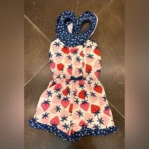 Sweet little romper adorned with strawberries and navy and white polka dots. Easy to get on and off and lightweight. My sweet girl loves the stretchy material so we own several different sizes and prints. Also, this fabric is great for my little one with sensory issues. No more complaining about the fit being too tight or itchy!!